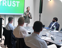 image of woman presenting. Jumio slideshow is being shown in the background.